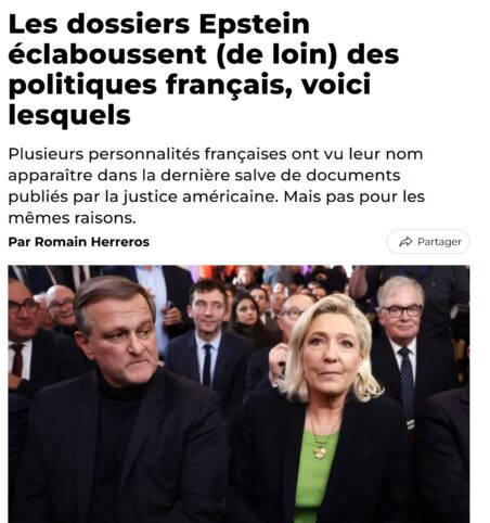 Il faut bien avouer que ces supposées révélations sur et autour de la rencontre de Marine Le Pen et Louis Aliot avec Steve Bannon en 2018, rapportée par Le Huff relèvent un peu de l’histoire de « l’homme qui a vu l’homme qui a vu l’ours », comme le lecteur pourra lui-même le constater en lisant l'article. Mais pourquoi pas. Plus loin, dans cet article, sont évoqués aussi Jack Lang, Cédric Villani et très brièvement Bruno Le Maire. Mais, comme par hasard, c'est Marine Le Pen qui décroche la timbale de l'illustration. On va dire que c'est la rançon de la gloire. Il n'empêche que la seule personnalité politique française vraiment « éclaboussée », non pas par les dossiers Epstein mais par Le Huff, est Marine Le Pen, à travers cette conjonction d'un titre d'article ambigu et de son illustration. De la belle ouvrage. Cela dit, on imagine qu'il en faut plus pour émouvoir Marine Le Pen.