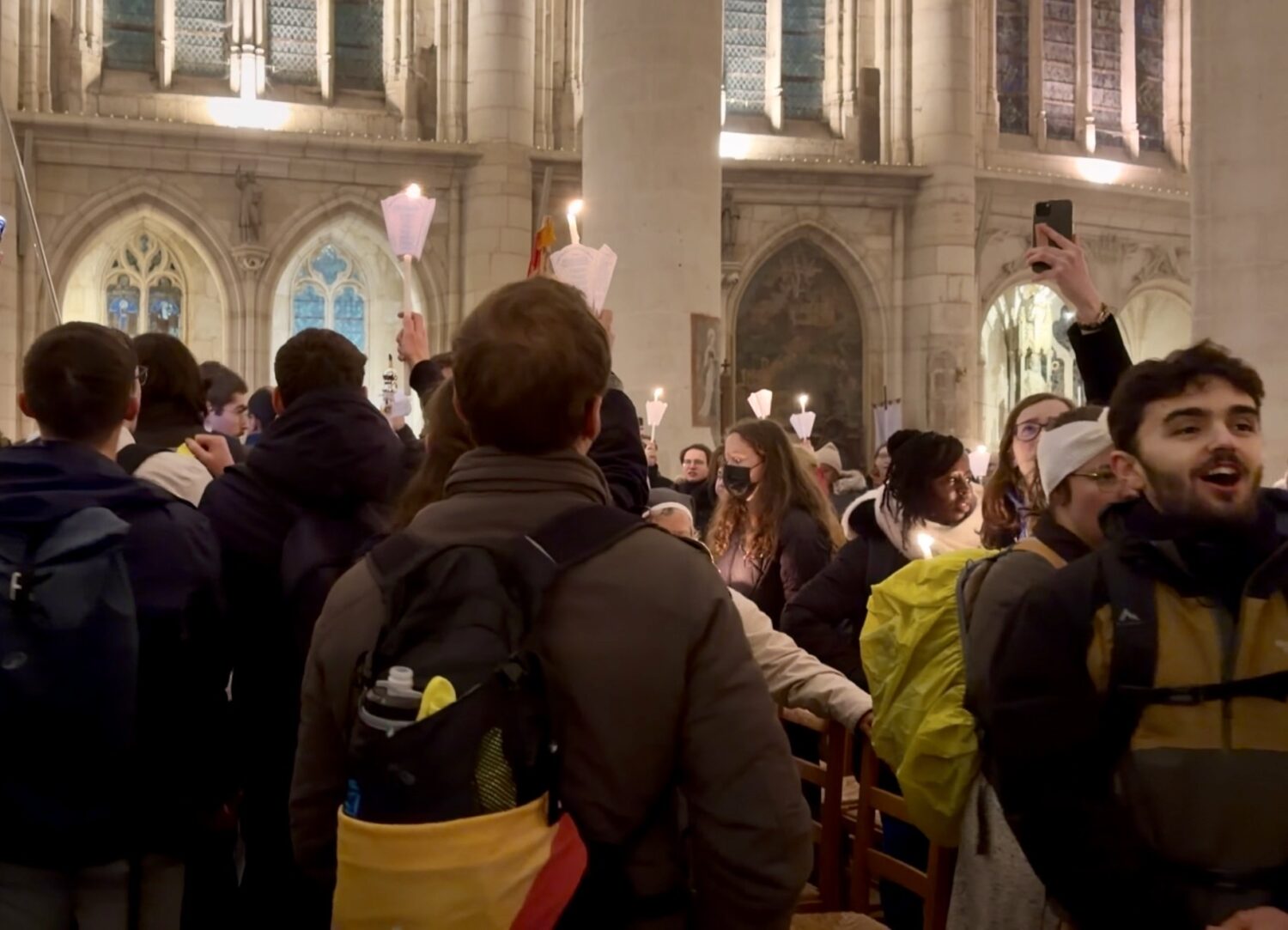 Le refrain qui entrecoupe de nombreux complets nous l'entendrons une bonne soixantaine de fois à l'intérieur de la basilique. Et à l'extérieur ! Certains clubs de foot peuvent se vanter d'avoir des groupes de supporters aussi loyaux qu'énergiques, généralement appelés Ultras. Saint Nicolas n'a rien cependant à leur envier. Comme l'a dit justement une de nos abonnés en commentaire, celui-ci « doit faire des jaloux au ciel ». En effet, sur le parvis, les alérions de l'étendard lorrain sont agités. Une centaine de jeunes pèlerins, ayant marché de Nancy à la basilique, reprennent à tue tête le cantique de leur saint patron. L'événement est victime de son succès populaire : ceux-ci ne pourront pas assister au sein de la Basilique faute de place. Qu'importe ! La statue et les trésors leur sont tout de même présentés comme au temps de jadis.