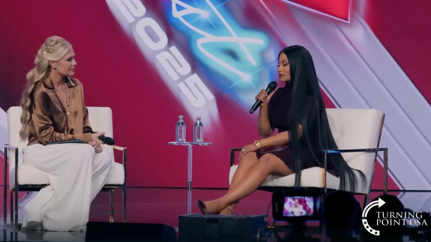 La reine du rap est intervenue, dimanche, aux côtés d'Erika Kirk à la convention annuelle du Turning Point USA.